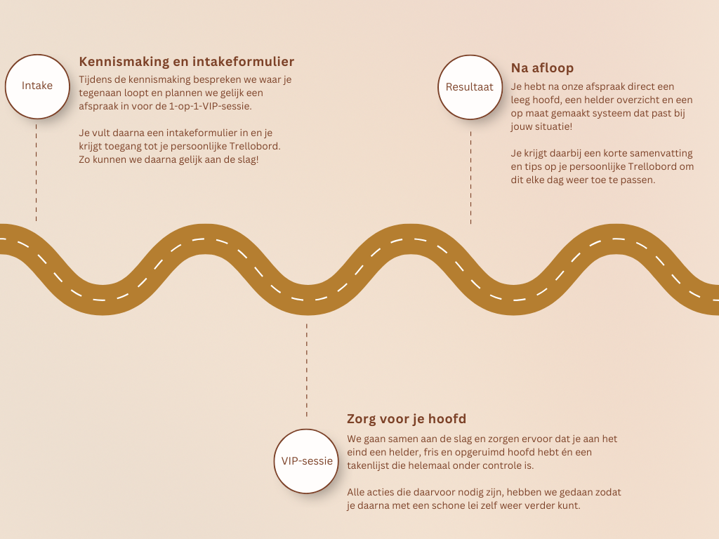 - Ik help je direct praktisch en persoonlijk bij het aanbrengen van overzicht in je hoofd. Alles wat nu door elkaar loopt, brengen we samen terug naar rust en structuur. We gaan 't gelijk opruimen op de plek waar het hoort. Dus uit je hoofd en in je planner. Stap voor stap en makkelijk, ook voor jou!